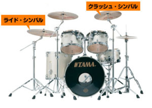 他にクラッシュシンバルやライドシンバルがある。一見叩くだけの楽器に見えるが、叩く場所によって音色が変わるので非常に奥が深い。